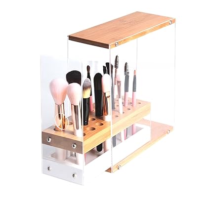 Jackcubedesign 31 Holes Acrylic Bamboo Brush Holder Organizer Beauty Cosmetic Display Stand With Leather Drawer White 8 77 X 3 38 X 8 46inches