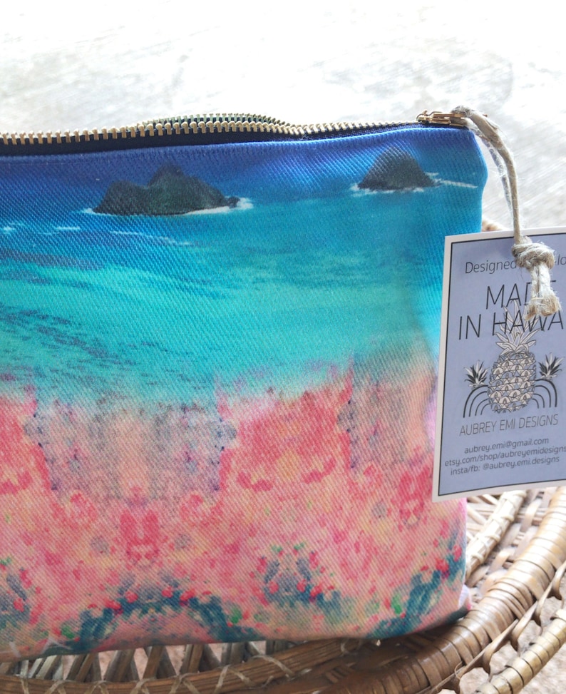 Aloha Cosmetic Makeup Bag Zipper Pouch Mokulua Islands Lanikai Art Colorful Pink And Blue Pouch Purse Supply Holder Tropical Print Purse
