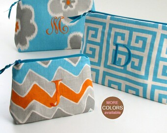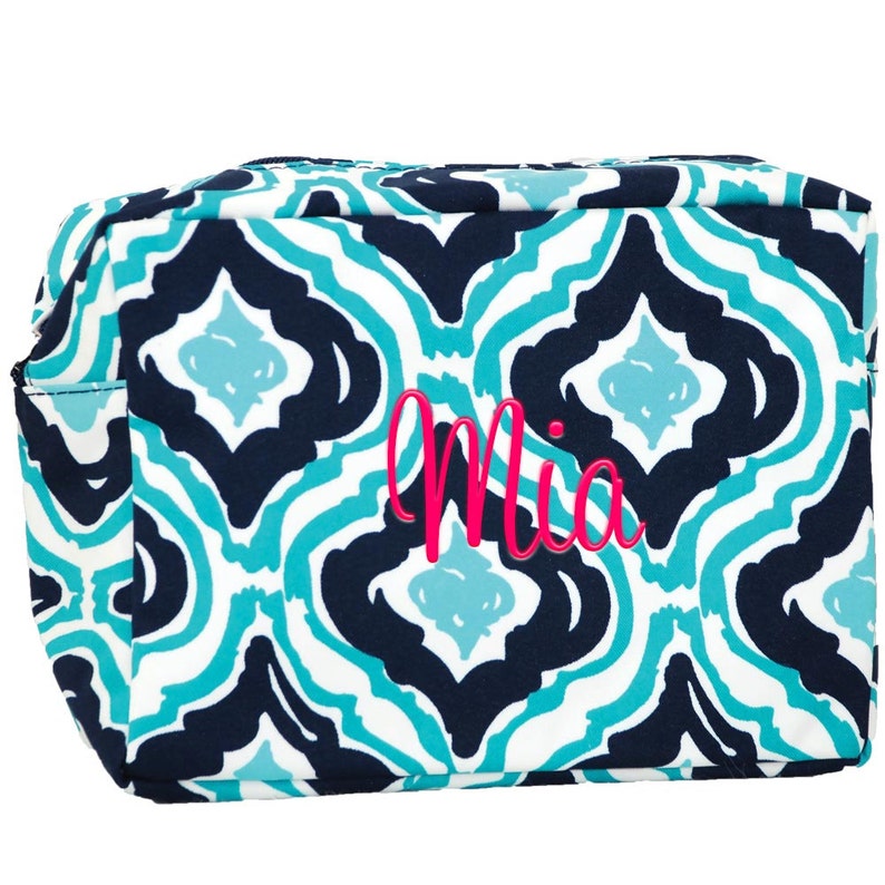 Monogram Ikat Navy And Aqua Blue Makeup Bag Large Cosmetic Etsy