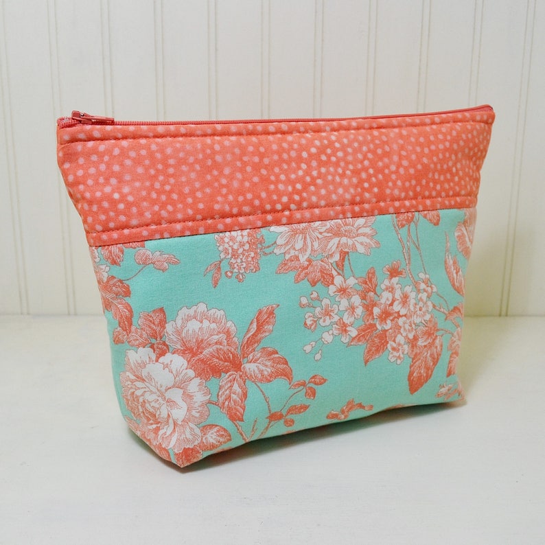 Floral Makeup Bag Coral Polka Dot Cosmetic Bag Aqua Toiletry Etsy