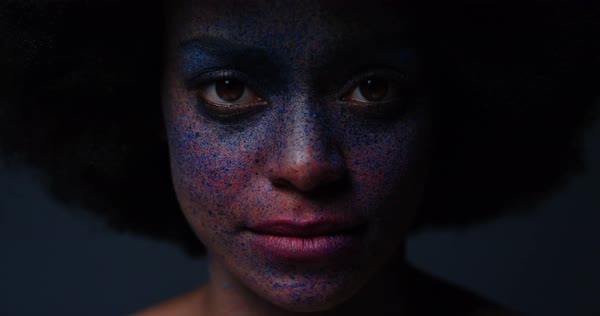 Close Up Portrait Beautiful African American Woman Wearing Exotic Face Paint Body Art Mysterious Female With Colorful Makeup Light Flashing In Dark