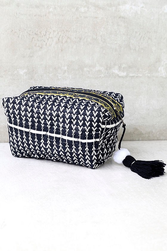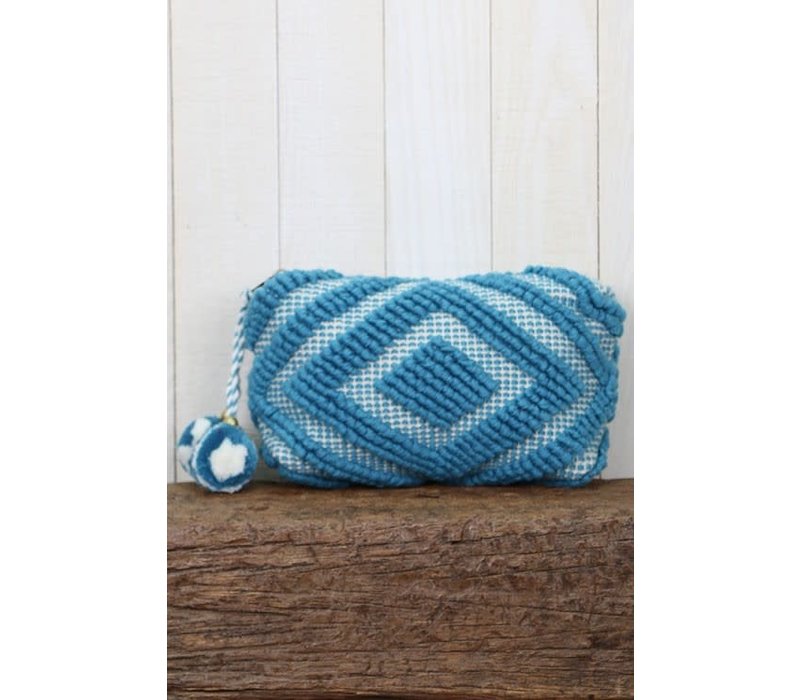 Large Woven Pom Pom Makeup Bag In Blue Little Gypsie Boutique
