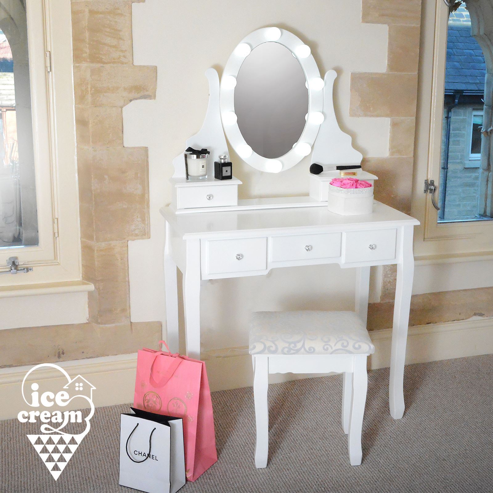 White Hollywood Dressing Table With Led Lights 5 Drawers Stool