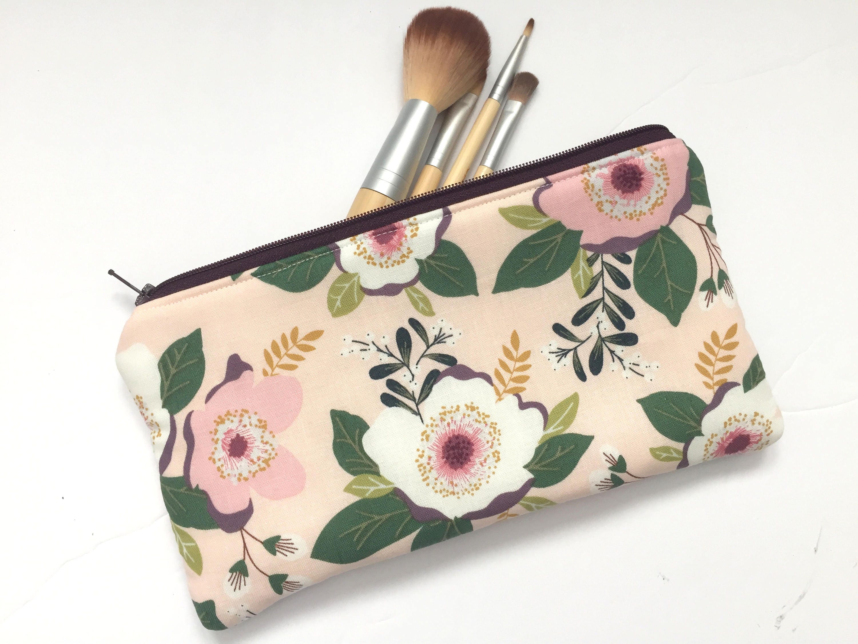 Blush Floral Makeup Brush Pouch Pink Floral Pencil Case Purple Makeup Bag Pink Organizer Gift For Her Under 15 Floral Travel Pouch