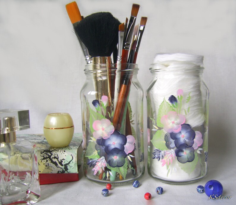 Makeup Brush Holder Painted Glass Jars Dressing Table Set Of 2 Makeup Brush Pot Glass Brush Holder Makeup Organizer Painted Glassware