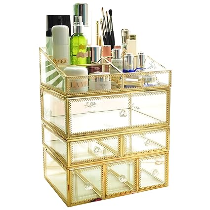 Hersoo Large Mirror Glass Top Dresser Make Up Organizer Jewelry Cosmetic Display Stackable Cube 6 Drawers Set Dresser Storage For Vanity With