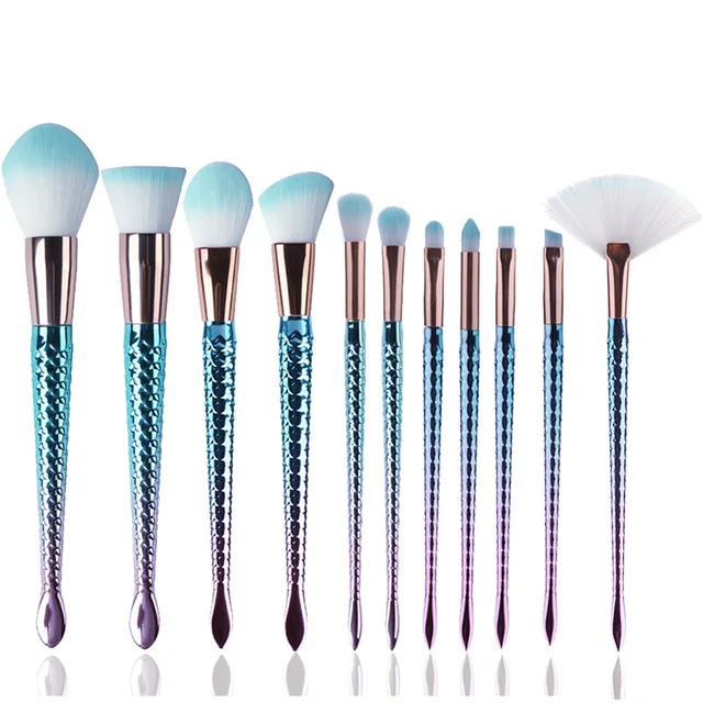 Us 12 99 11pcs Light Blue Mermaid Makeup Brush Power Foundation Blusher Fishtail Shape Makeup Brushes Set Kits Multipurpose Makeup Brush In Eye