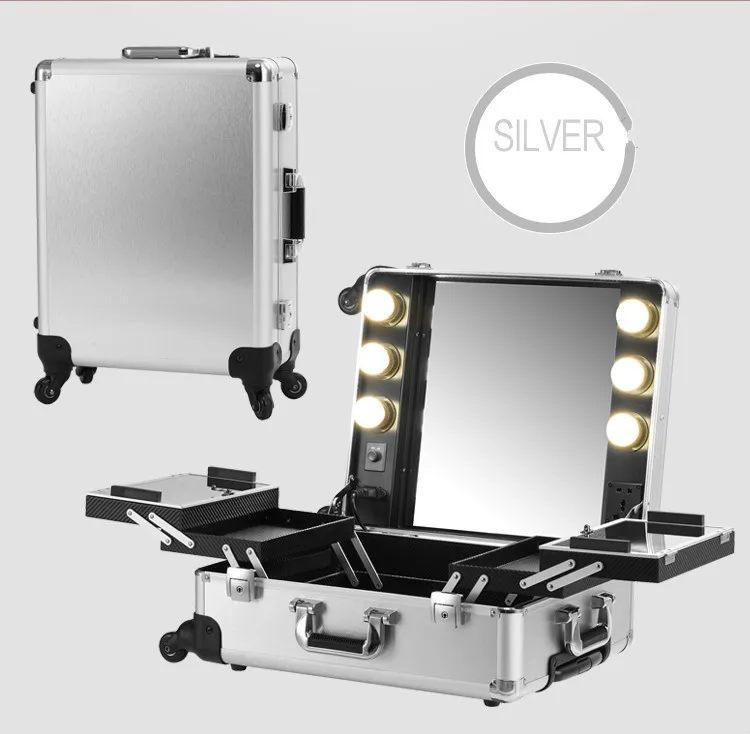 Silver Led White Light Makeup Artist Train Box Aluminum Rolling