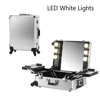 Silver Led White Light Makeup Artist Train Box Aluminum Rolling