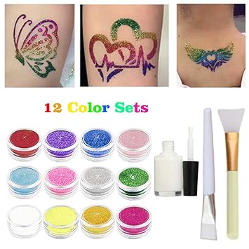 Glitter Temporary Tattoos Makeup Kits Glitter Body Art Party Accessory With 12 Large Glitter Colors 1 Glue