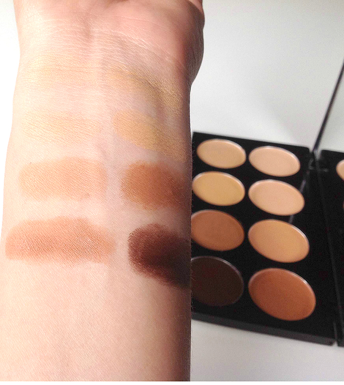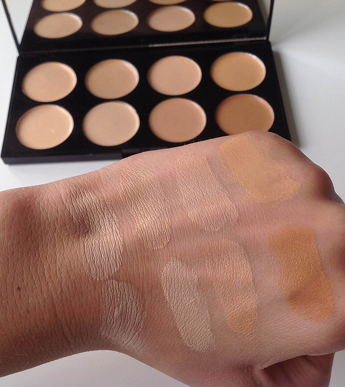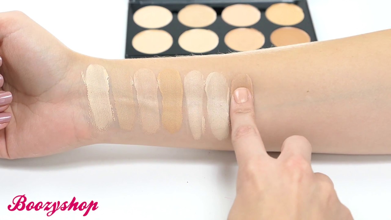 In a professional palette with a mirror in the lid perfect for touchups during the day. There are eight varying shades in the palette from an almost white shade to a dark sand. Portable and all in one this palette includes sixteen shades in a mix for light to medium skin tones plus peach and yellow tones to brighten and correct. Ochen dostoynaya paletka osobenno za svoyu tsenu.
