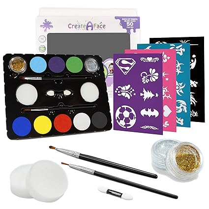 Face paint kit for kids 60 jumbo stencils 15 large water based paints 2 glitters halloween makeup kit professional face paint palette face paints safe for sensitive skin face painting book.