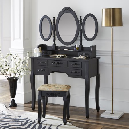 Costway Black Tri Folding Mirror Vanity Makeup Table Set Bathroom W