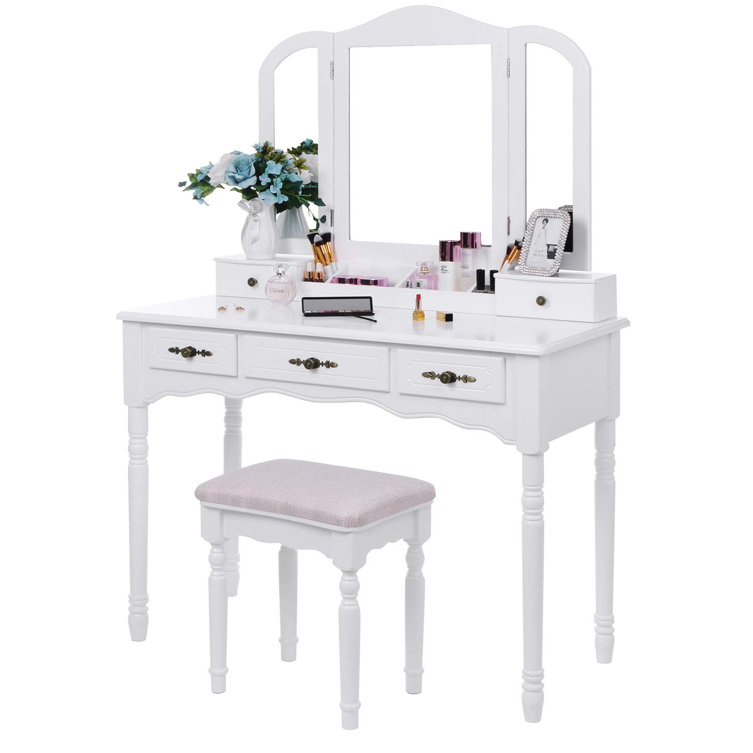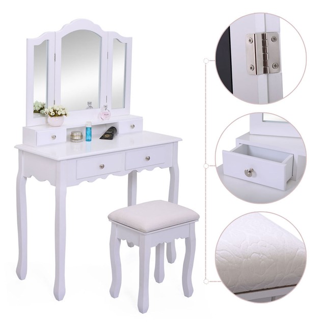 Gymax vanity makeup dressing table set wstool 4 drawermirror jewelry wood black. Vasagle vanity table with flip top mirror solid wood makeup dressing table desk6 organizers for different sized makeup accessories 1 small drawers for. Arrange a well lit nook somewhere in the bedroom to take care of your beauty. The right features can take add extra functionality for your makeup table which will make it much easier for you to put on makeup or do your hair.