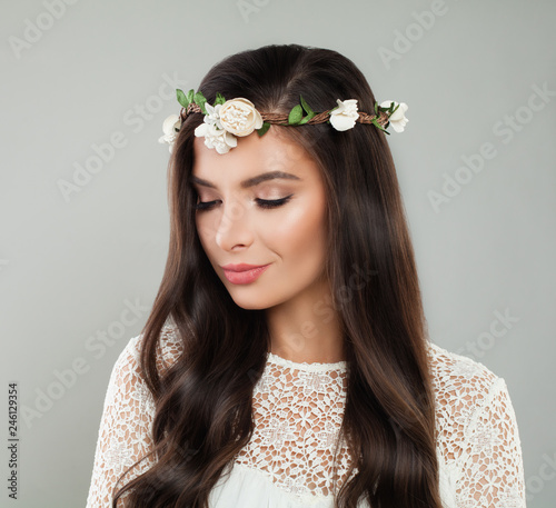 Young Beautiful Woman With White Flowers On Head Natural Makeup And