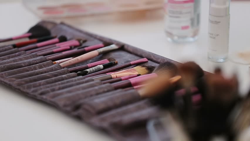 Make Up Table In Beauty Salon Set Of Professional Brushes For Makeup