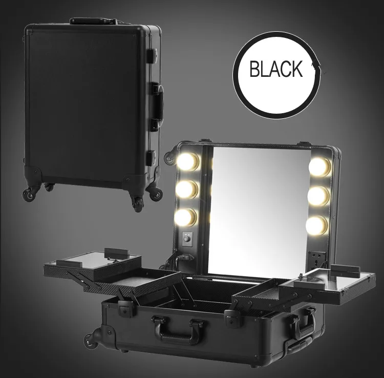Black Makeup Case Lights Professional Rolling Cosmetic Station Box