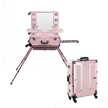Rolling Studio Makeup Artist Cosmetic Case W Light Leg Mirror Pink