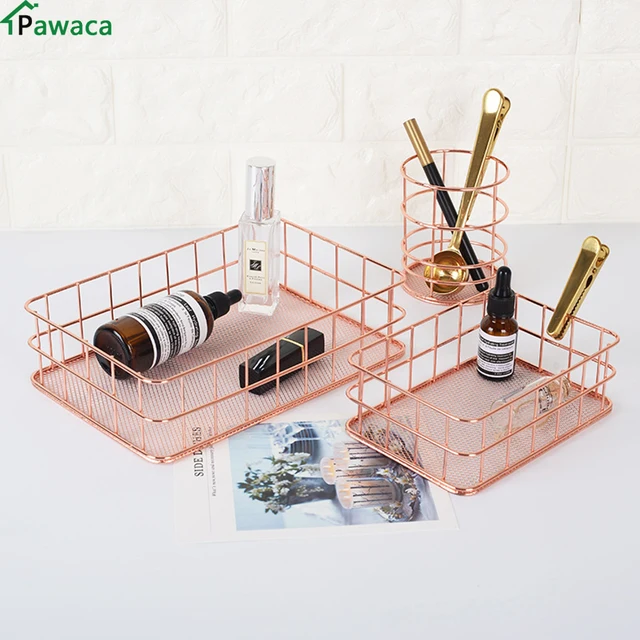 Copper Storage Basket Cosmetic Organizer Rose Gold Makeup Brushes