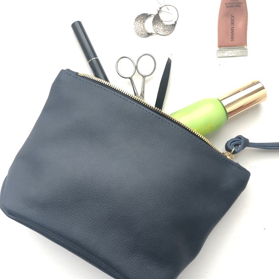 Navy Blue Leather Makeup Bag Monogrammed Leather Clutch Etsy
