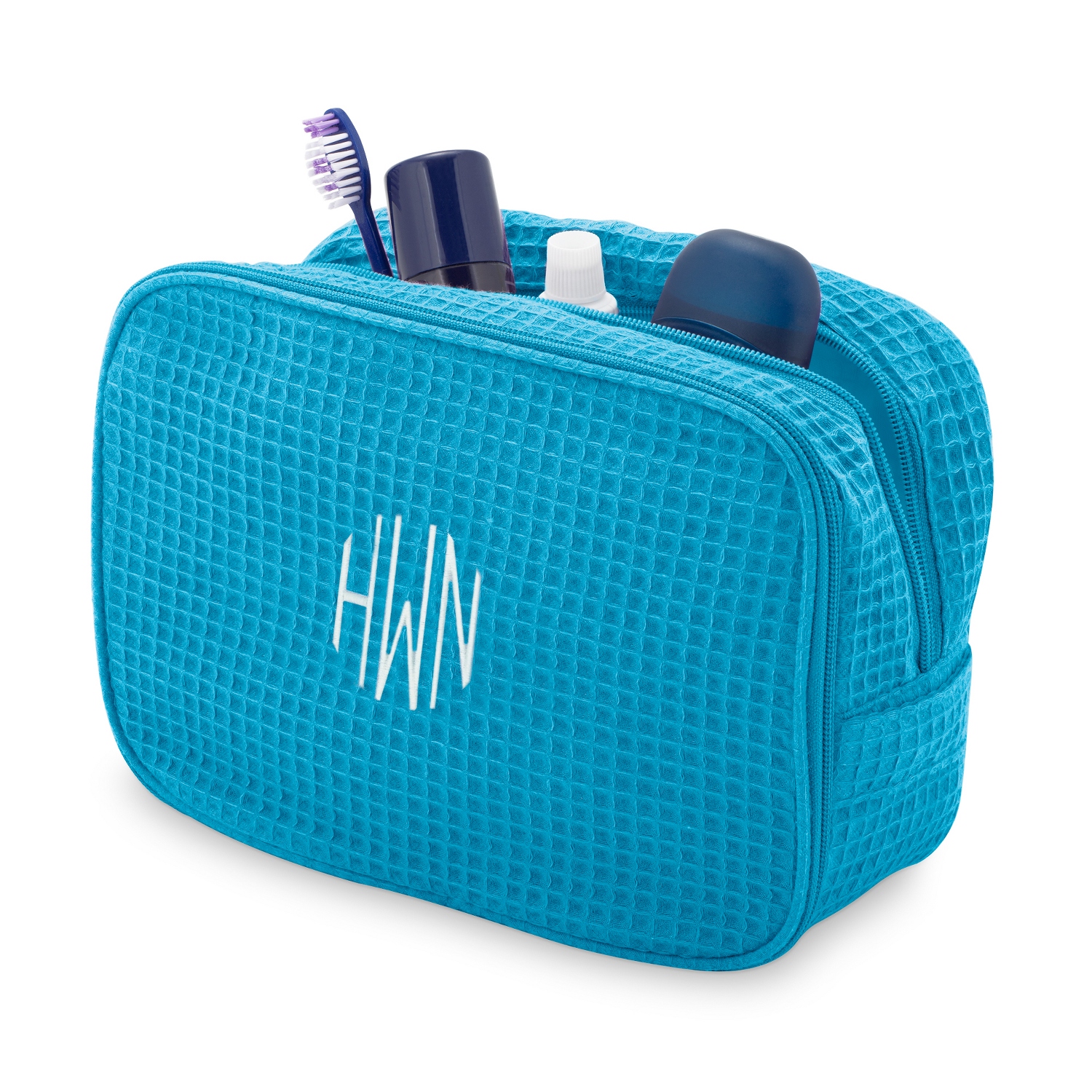 Perfect for a spa visit travel or the gym. Personalized waffle weave cosmetic bag makeup case toiletry case portable travel organizer embroidered with your name or text large turquoise more buying choices 2199 1 new offer hanging toiletry bag airlab large cosmetic bag with handle and hook travel toiletry organizer for men and women size.