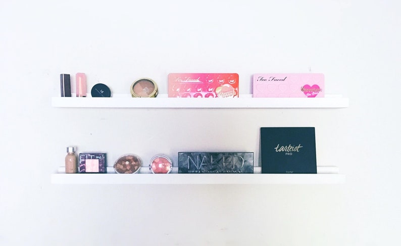 Wall mounted makeup shelf makeup organizer nail polish holder make up shelf monogramed makeup organizer hanging makeup shelf highlanddesignco 5 out of 5 stars 830 14500 favorite. Skip to main content. If youve been on the hunt for a beauty storage system thats worthy of your mammoth makeup stash let us be your inspiration. 2 product ratings mdesign plastic wall mount 2 tier storage organizer shelf hold vitamins oils 1169.