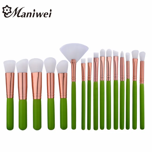 Maniwei 16pcs Makeup Brushes Green Handle Rose Tube White Hair