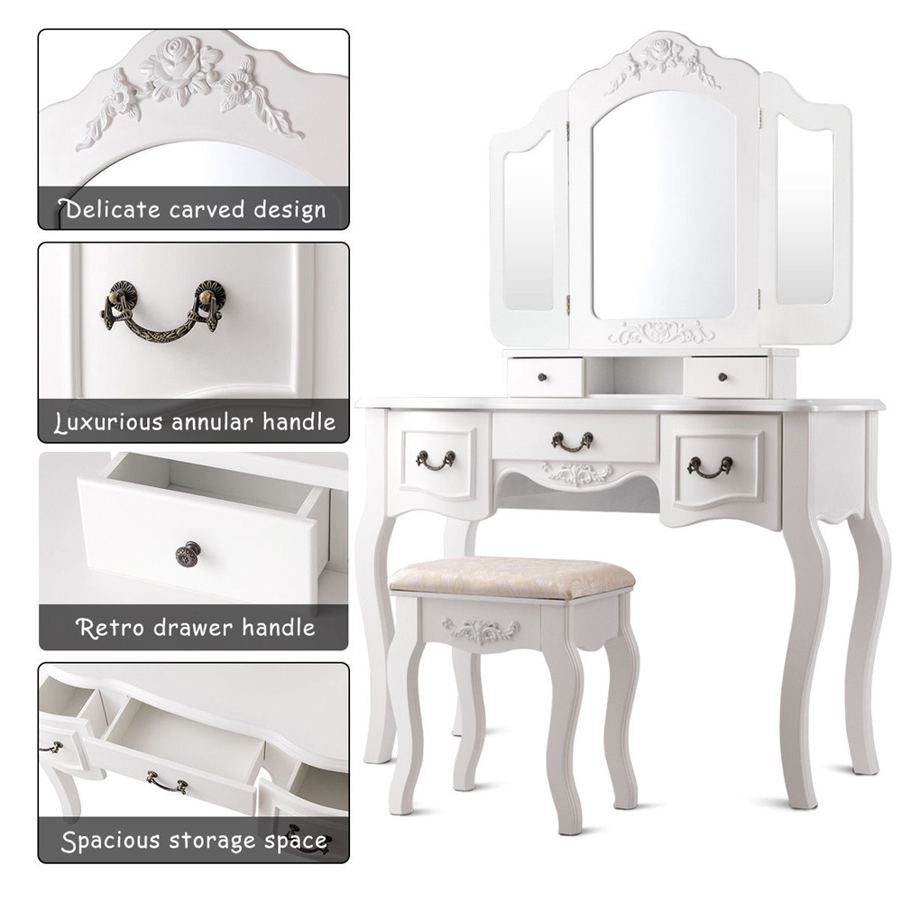 Goplus Tri Folding Mirror White Wood Vanity Set Makeup Table Dresser