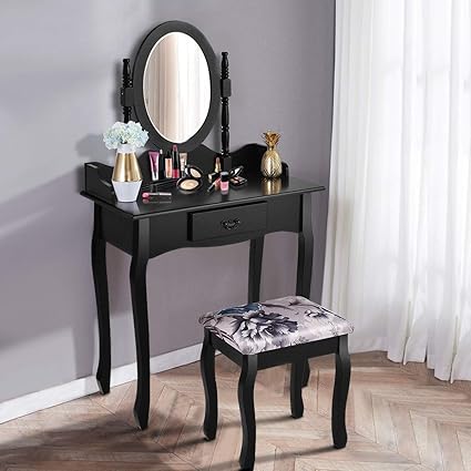 Costway Black Tri Folding Oval Mirror Wood Vanity Makeup Table Set